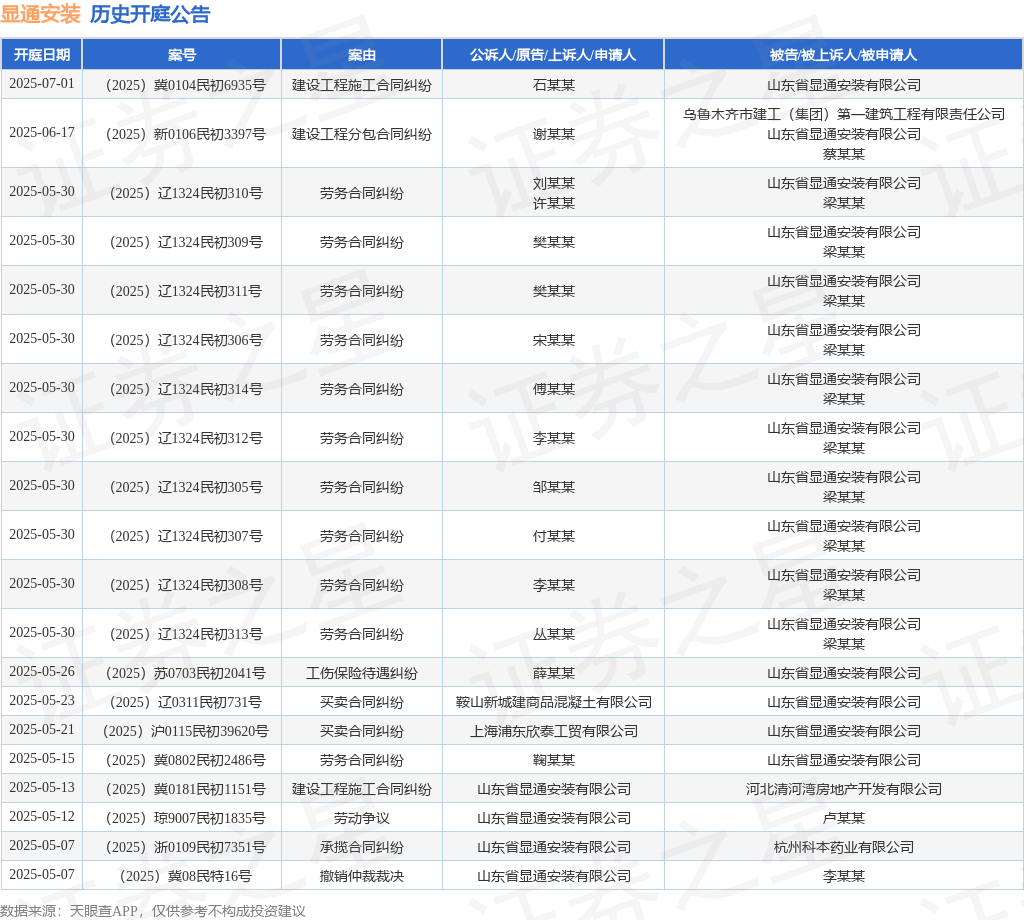 案号:(2025)冀0181民初1151号审理法院:辛集市人民法院案由:建设工程施工合同纠纷当事人信息: 原告/上诉人:山东省显通安装有限公司 被告/被上诉人:河北清河湾房地产开发有限公司开庭日期:2025年5月13日根据统计,近一年内以山东省显通安装有限公司为当事人的历史开庭公告有185则,其中案由为“劳务合同纠纷”的公告以37则居首,其次为“建设工程施工合同纠纷”有37则,“劳动争议”有27则。历史开庭公告(前20条)如下: